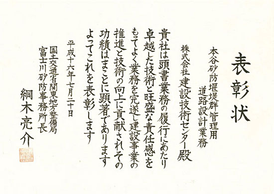 【平成16年7月(所長表彰)】本谷砂防堰堤群管理用道路設計業務
