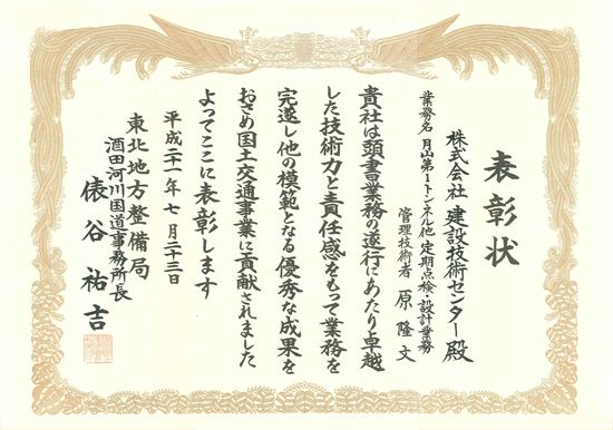 所長表彰 発注先 国土交通省 東北地方整備局 酒田河川国道事務所 件 名 【平成21年7月(所長表彰)】月山第1トンネル他定期点検・設計業務 着手日 平成20年08月12日 完了日 平成21年01月23日